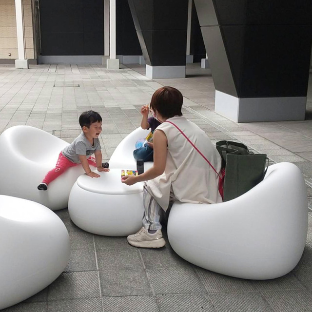 まずみなさん驚かれるのがこのマシュマロっぽい見た目とポリエチレン樹脂製でできた素材の質感のギャップ。「触れてみると硬いのね…」とおっしゃります。