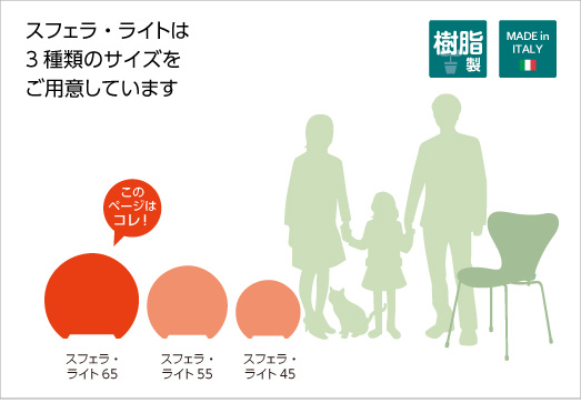 ▲スフェラ(屋内用)はΦ45cm・Φ55cm・Φ65cmの3サイズ展開です。