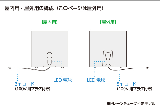 | 付属品 | 100V用プラグ付5mコード(VCT-FK 1.25) LED(電球40W相当)を標準装備。 寿命約40,000時間。取扱説明書、保証書 |