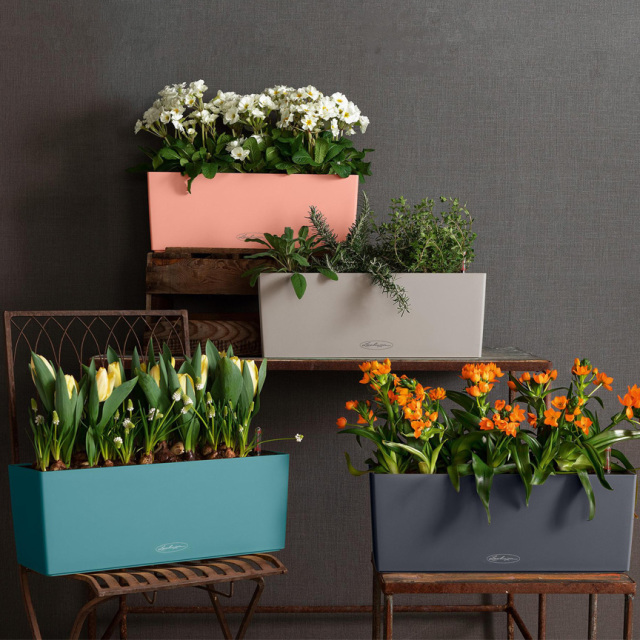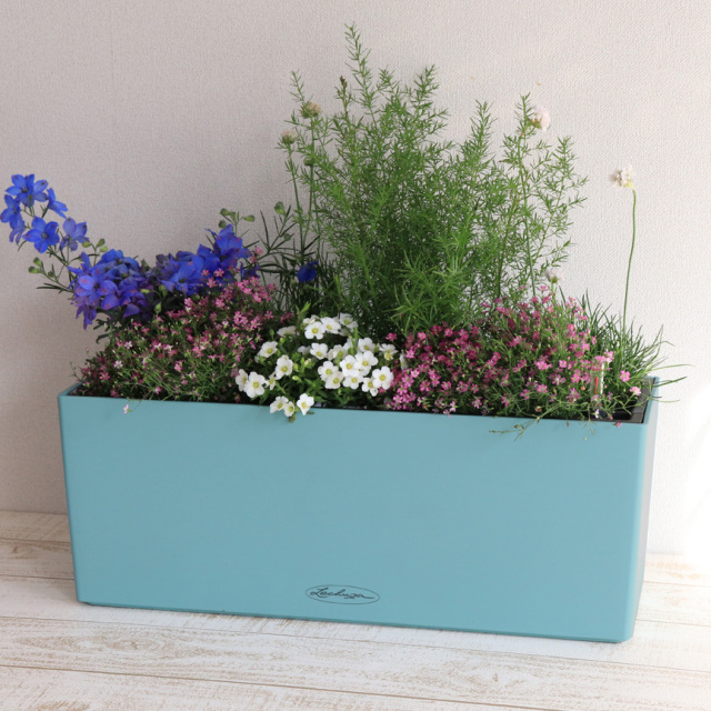 他ではお目にかかれないカラープランターです。どの色も植物のグリーンとマッチします。