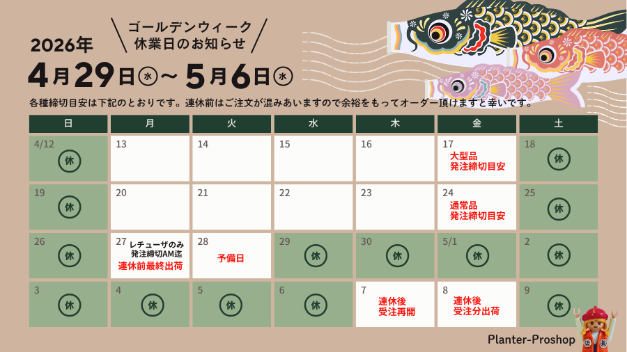 2026年4月29日(水)~5月6日(水)はゴールデンウィーク休業に伴い、お問い合わせ対応・発送業務をお休みさせていただきます。